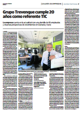 Trevenque Group cumple veinte años con buenas perspectivas de crecimiento. Este es el comienzo de la noticia publicada en el especial «Expectativas» del diario Ideal del domingo 13 de Mayo, en la que hace un resumen de la trayectoria seguida por la empresa desde su fundación en 1992 hasta la actualidad y una especial mención a las principales líneas estratégicas que va a seguir para consolidar y ampliar su posicionamiento en el mercado nacional e internacional. Pulse la siguiente imagen para leer la noticia completa